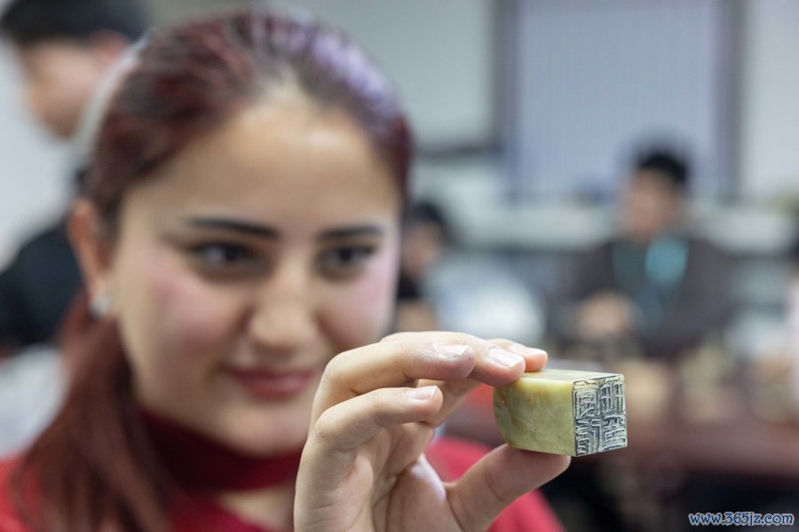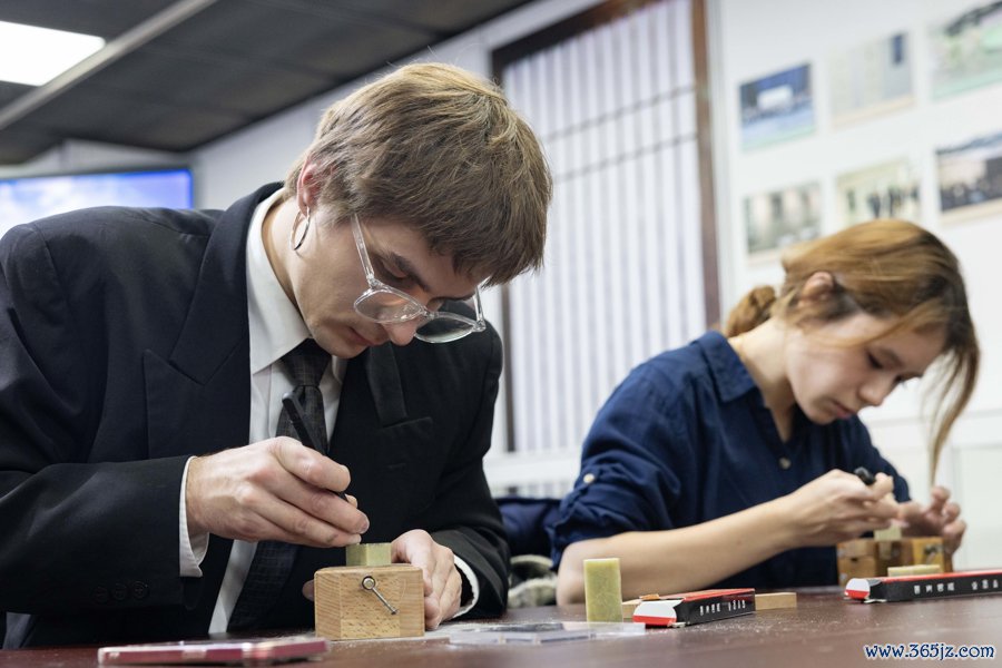 俄罗斯留学生赵吉将制品钤记轻按宣纸,朱红“赵吉”二字鲜嫩呈现,他感触说念:“汉字是中华传统文化的精髓,亲手电刻我方的中文名字钤记,相配有趣。”